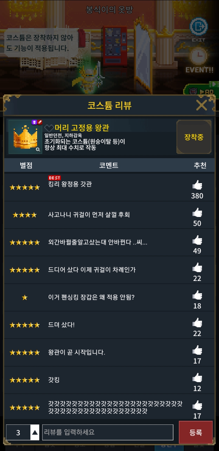 머리 고정용 왕관은 초기화가 되는 코스튬을 항상