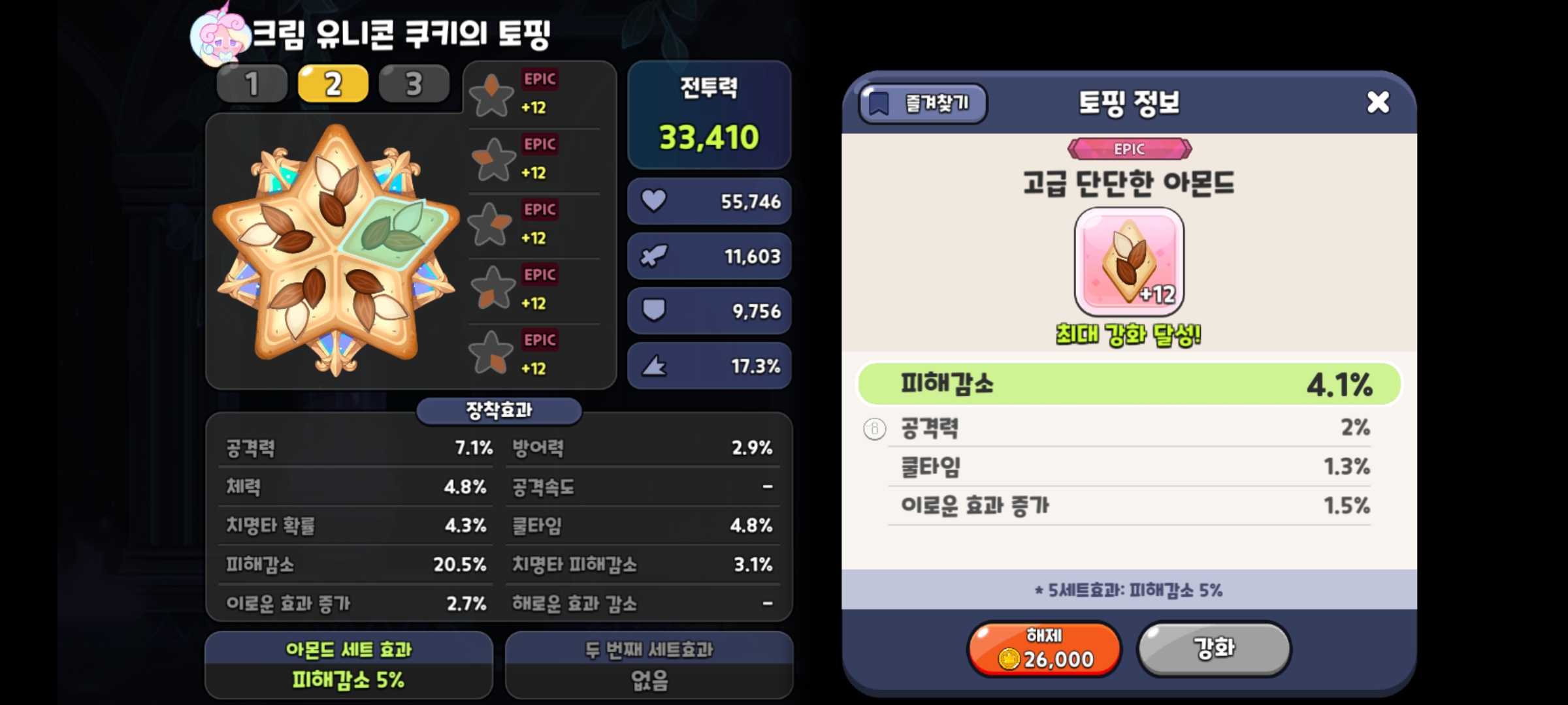 아무래도 회복형 쿠키다 보니 아무래도 잘 죽기 때문에 피해감소인 아몬드 토핑에 부옵션도 피해감소로 맞춰서 생존력을 유지하기 위한 세팅으로 아레나에서 주로 사용이 될 세팅이고, 상황에 따라 다른 콘텐츠에서도 사용이 될 것 같습니다^^