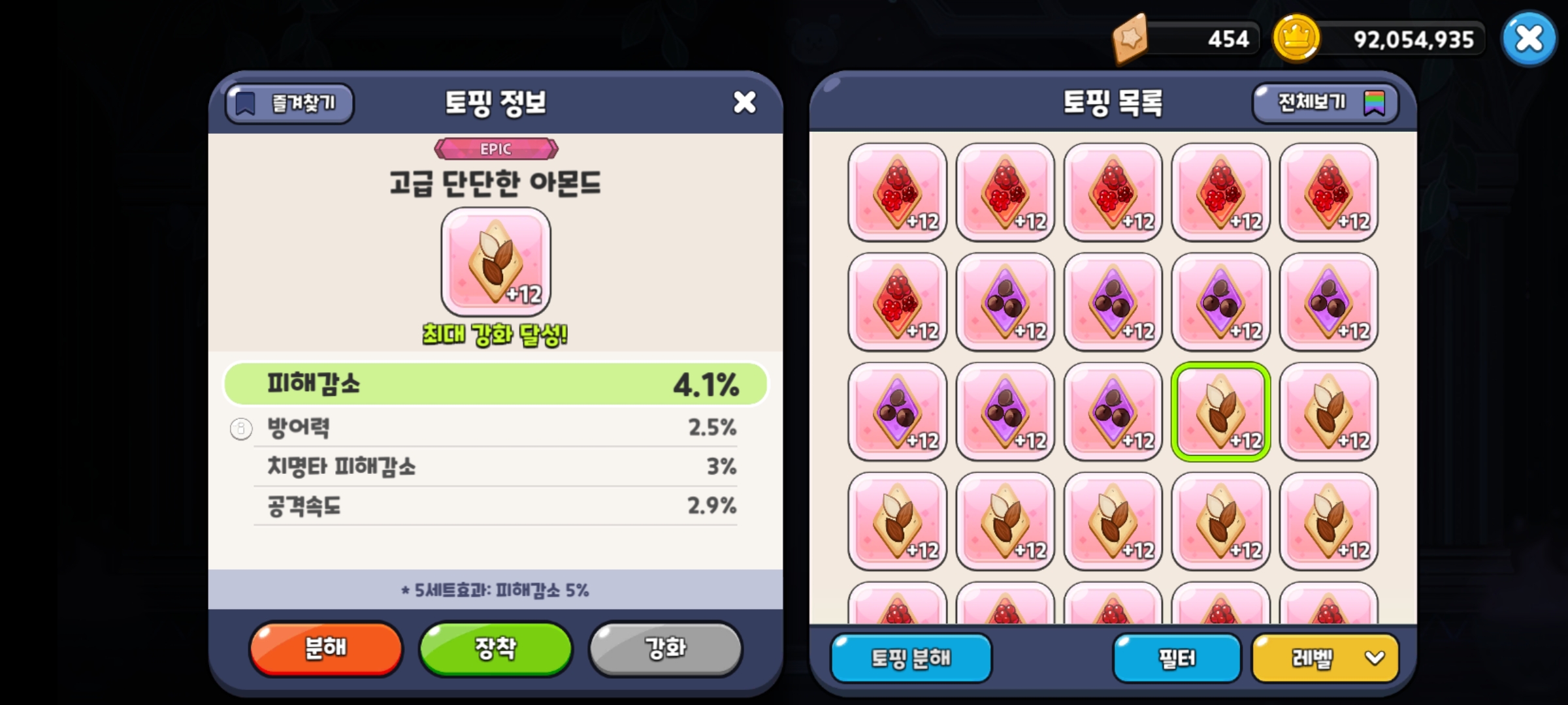 주로 사용되는 토핑으로는 All 초콜릿칩으로 부옵션은 피해감소를 1순위로 맞춰주시구요! 2순위로는 쿨타임을 추천드려요^^