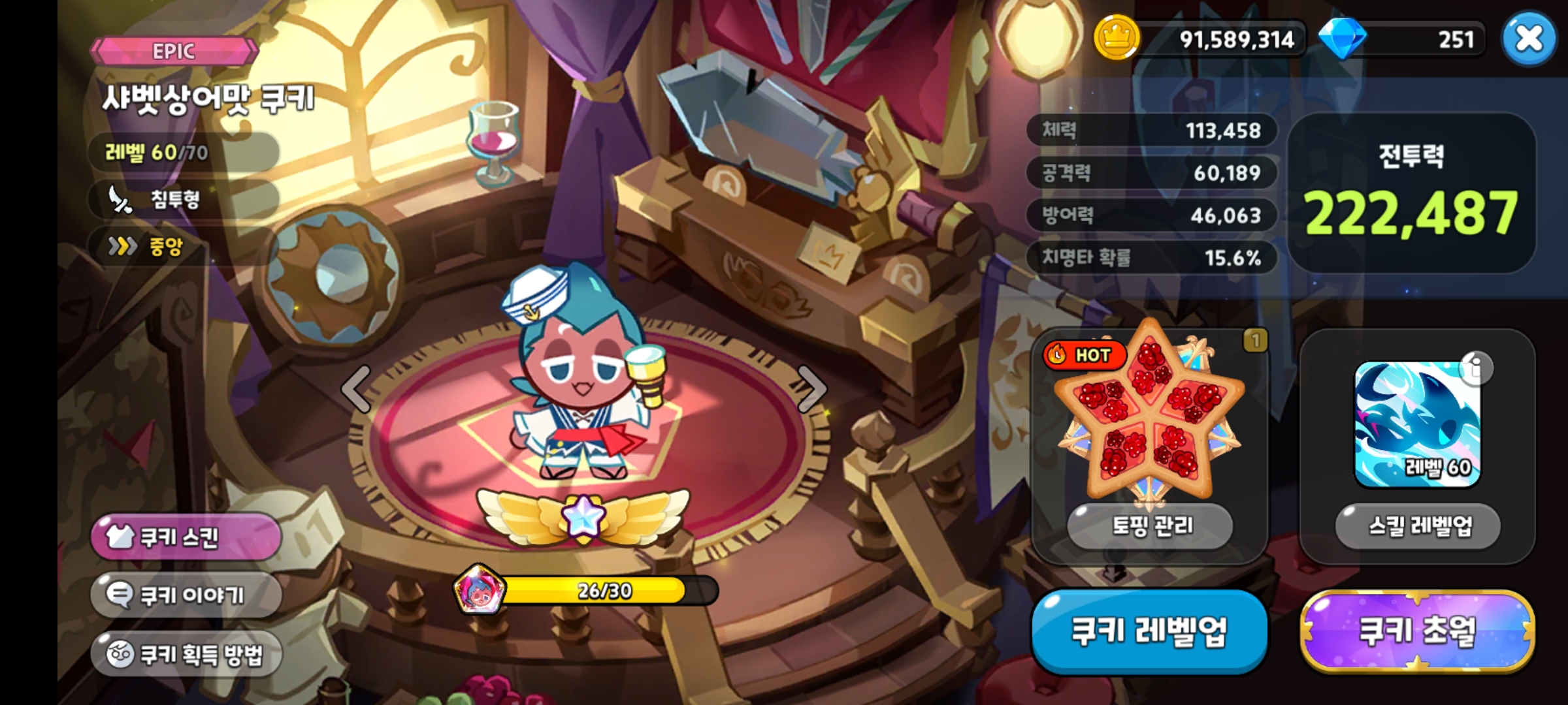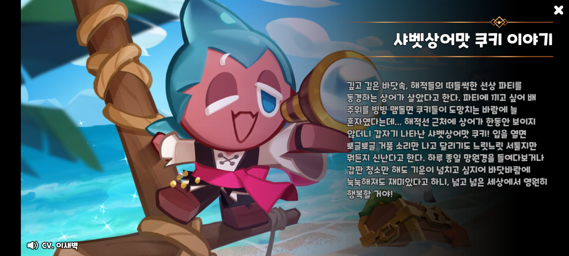 샤벳상어맛 쿠키는 침투형 중앙 쿠키로 스킬을 사용할 때 잠깐 공격을 받지 않는 상태가 되고 최대 체력이 가장 높은 적에게는 최대 체력에 비례한 고정 데미지를 부여하는 특징을 가진 쿠키인데요~