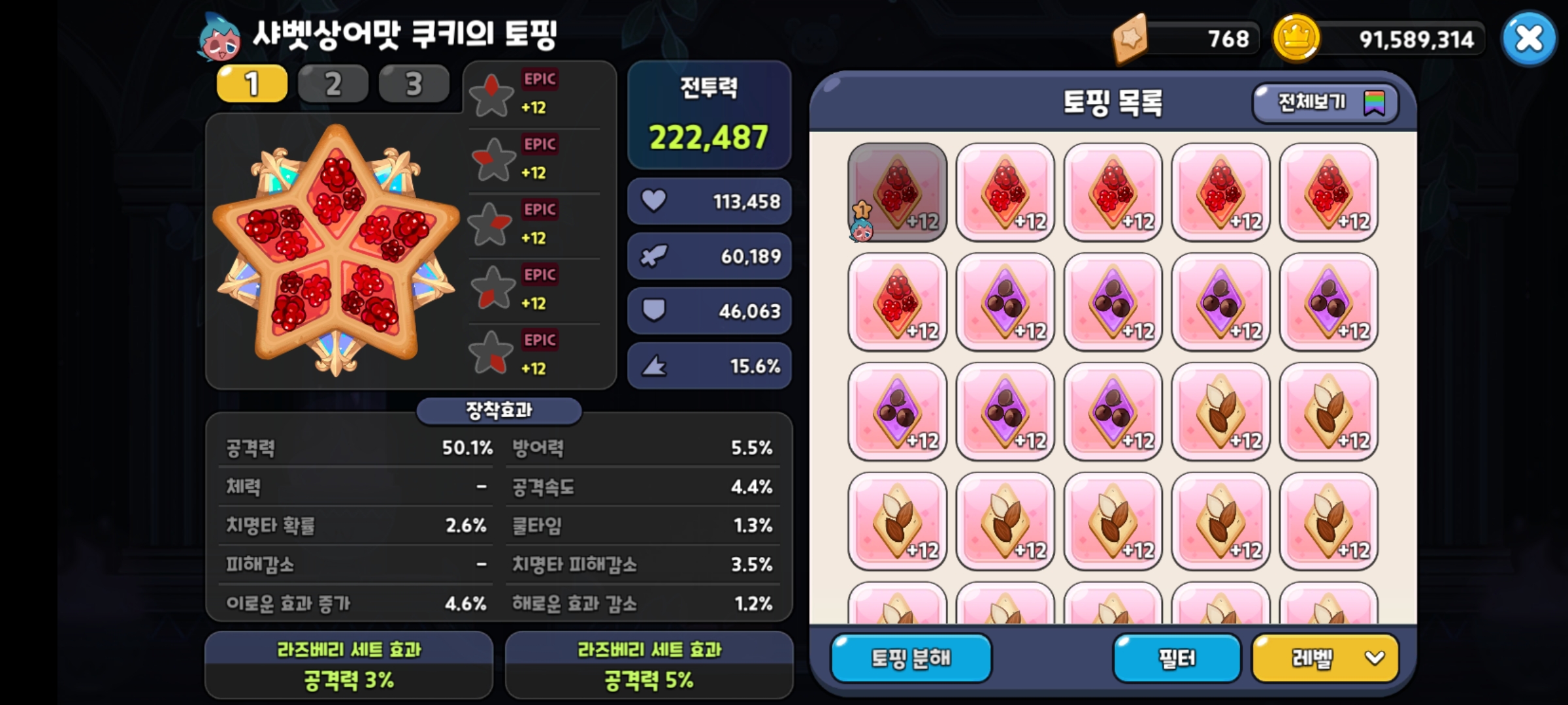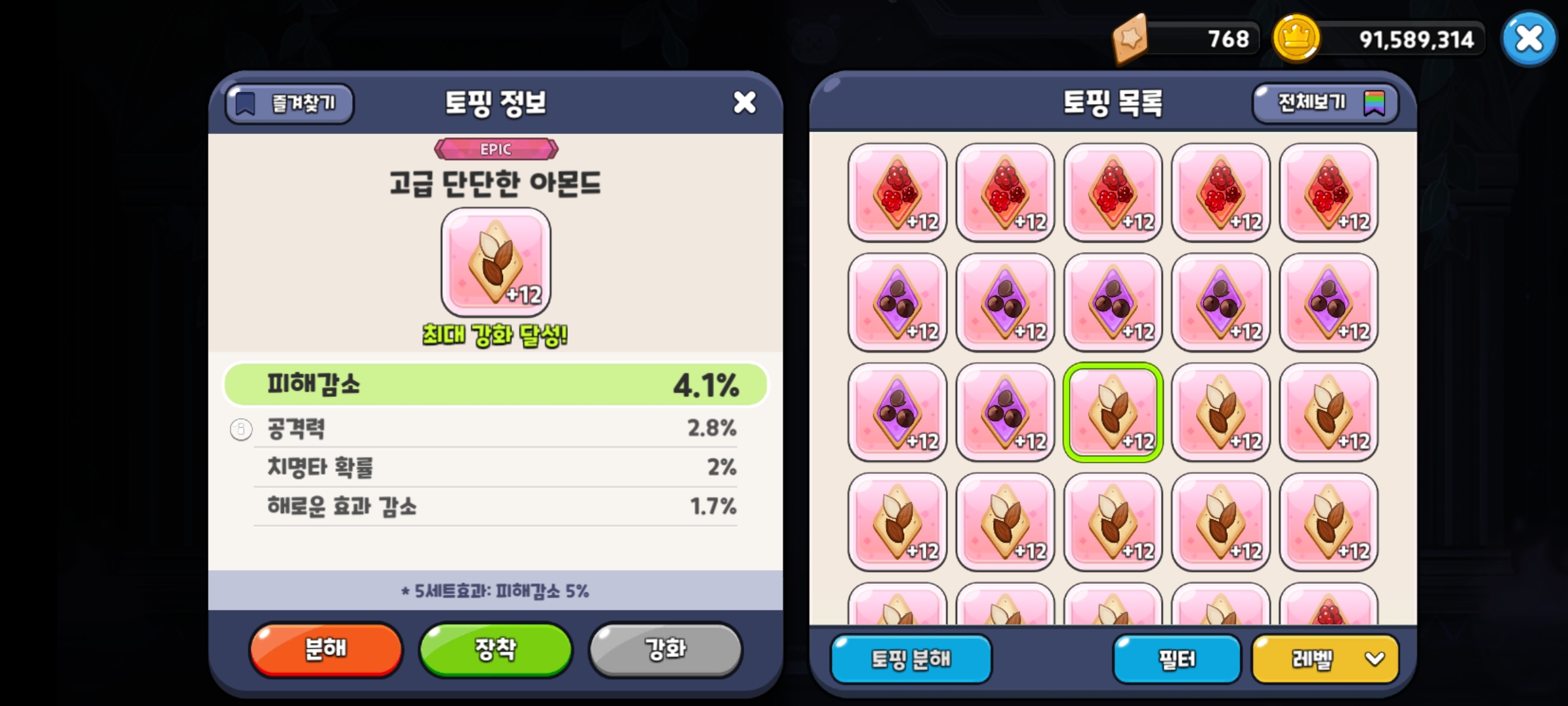 두번째 토핑으로는 라즈베리 부옵션에 피해감소가 부족할 경우! 아몬드 토핑으로 라즈베리3 & 아몬드2 로 생존력을 증가시키는 것도 권해드립니다^^