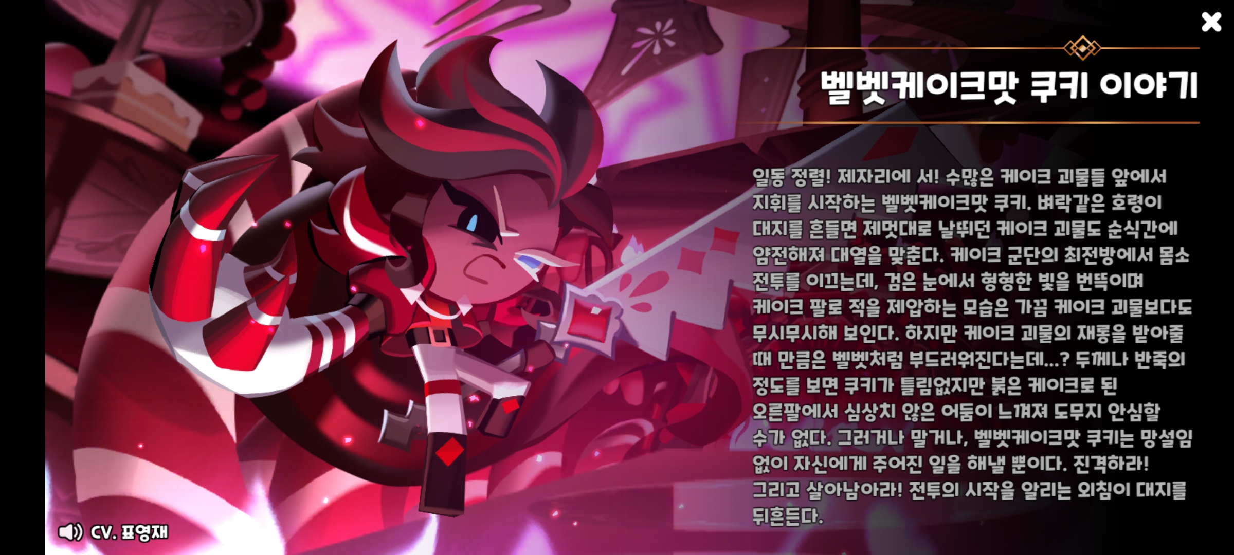 벨벳케이크맛 쿠키는 돌격형 전방 쿠키로 가장 뒤에 있는 적을 아군 앞에 끌고와 기절을 시키는 특징을 가진 쿠키인데요?!